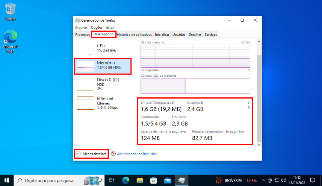 Com o Gerenciador de Tarefas aberto, você vai abrir a aba “Desempenho” e depois clicar em “Memória”. Na parte da direita é possível ver a maioria das informações de memória RAM do seu PC.